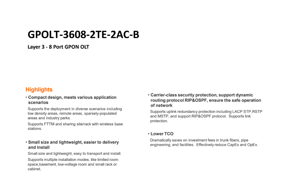 Introducing our 8 Port GPON OLT: the robust solution for expanding fiber optic networks. With eight ports, it delivers seamless connectivity and scalability ideal for medium to large-scale deployments. Upgrade now for reliable and efficient network performance.