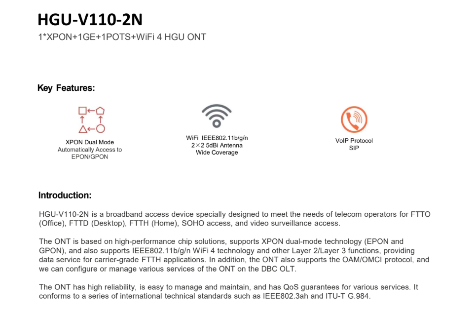 Introducing the HGU V100 2N: your comprehensive networking solution for home and small business environments. With dual Gigabit Ethernet ports, Wi-Fi capabilities, and VoIP support, it ensures seamless connectivity and communication. Upgrade now for reliable and versatile networking performance.